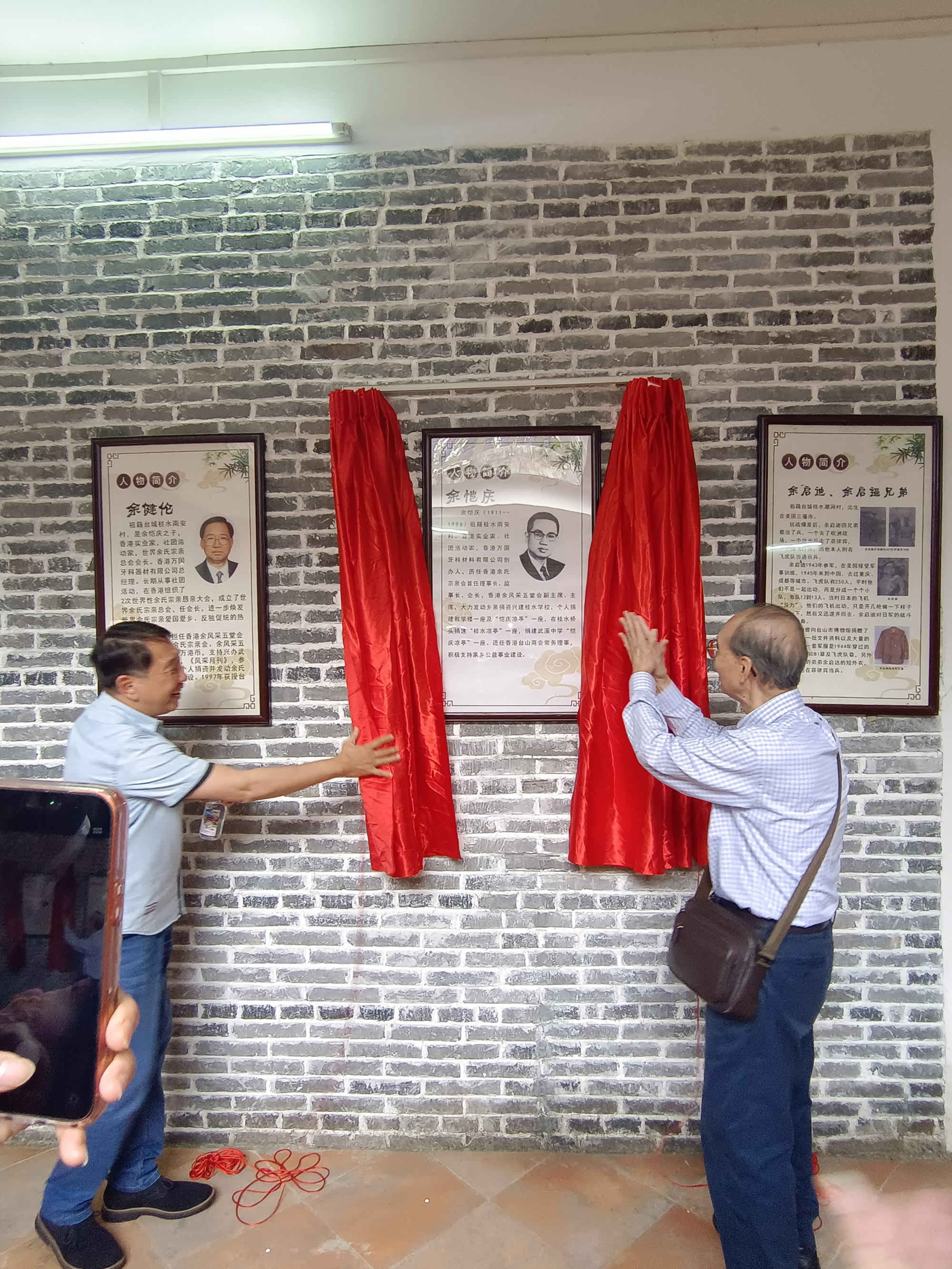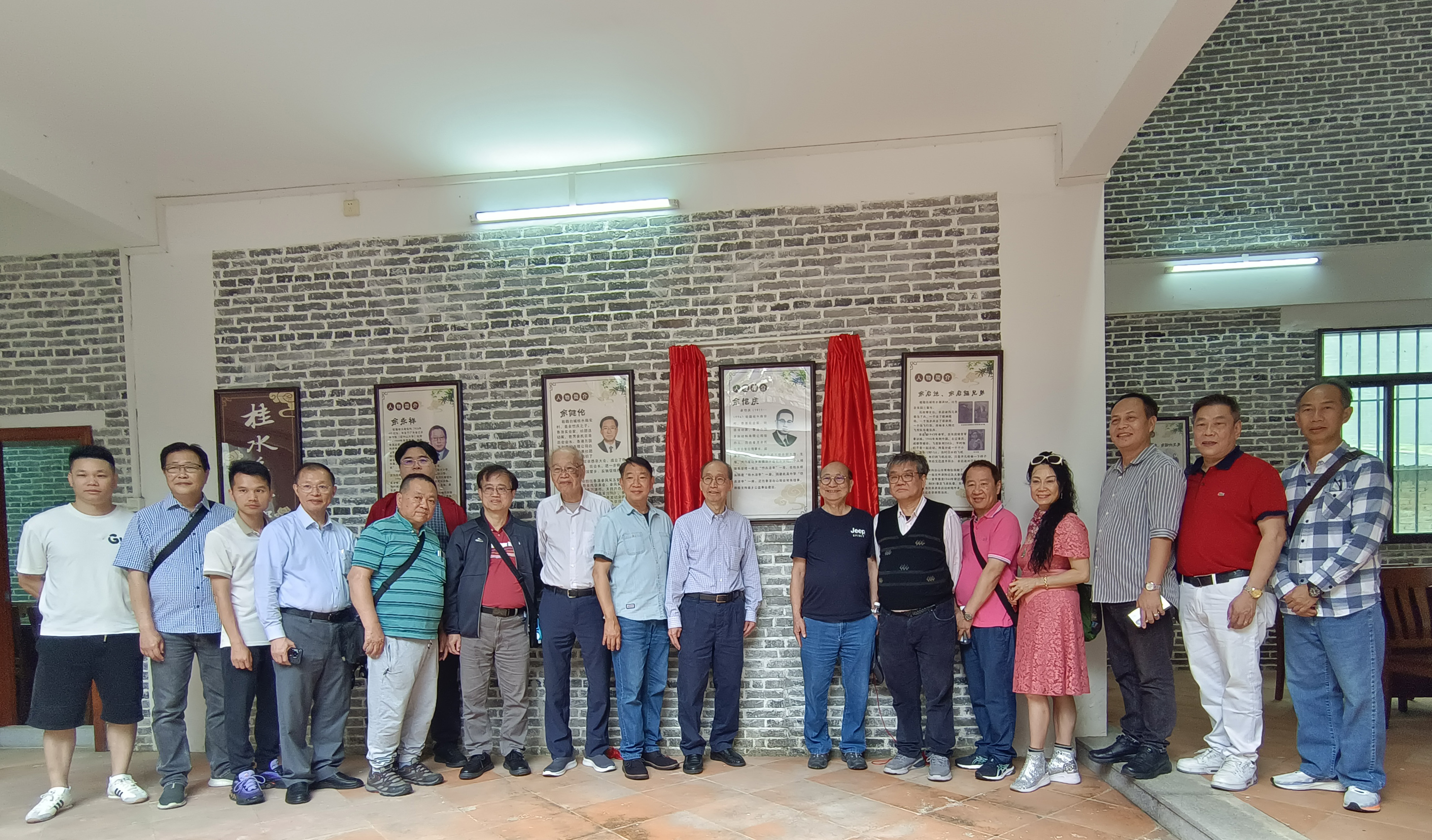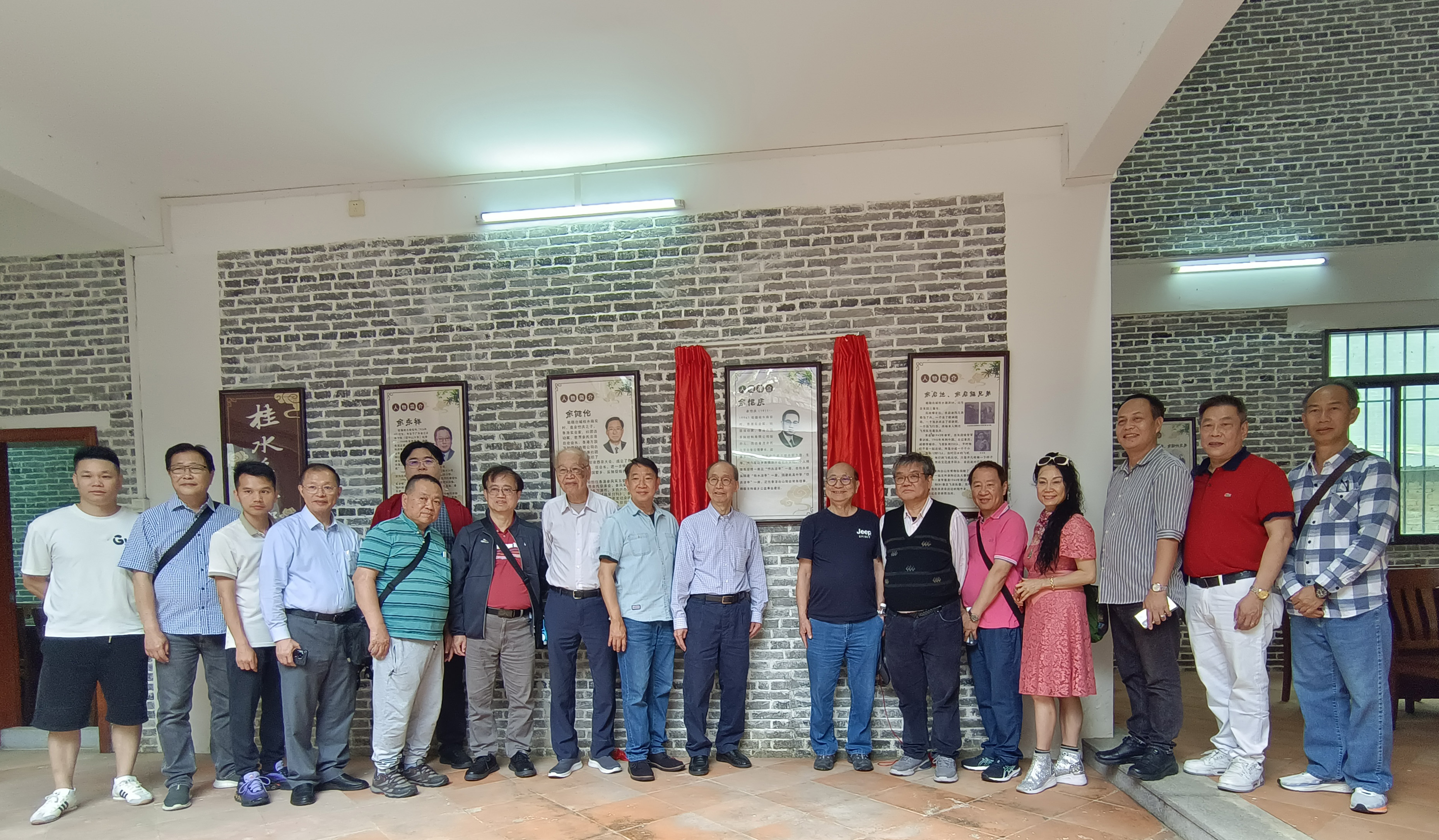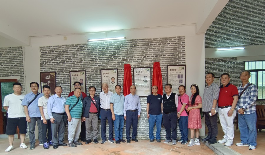 抵达当天,桂水村委会书记兼主任余伟强、风采月刊社社长余民发热情接待,并全程陪同。一行人先乘坐观光车,参观了桂水村村场及主要文明村示范点,随后前往新落成的“良甫余公祠”。在祠堂内,余伟强书记特意准备了一份惊喜——为余健伦会长的先父举行桂水历史人物“余恺庆简介”揭牌仪式。红绸缓缓揭下,现场庄重而喜悦。