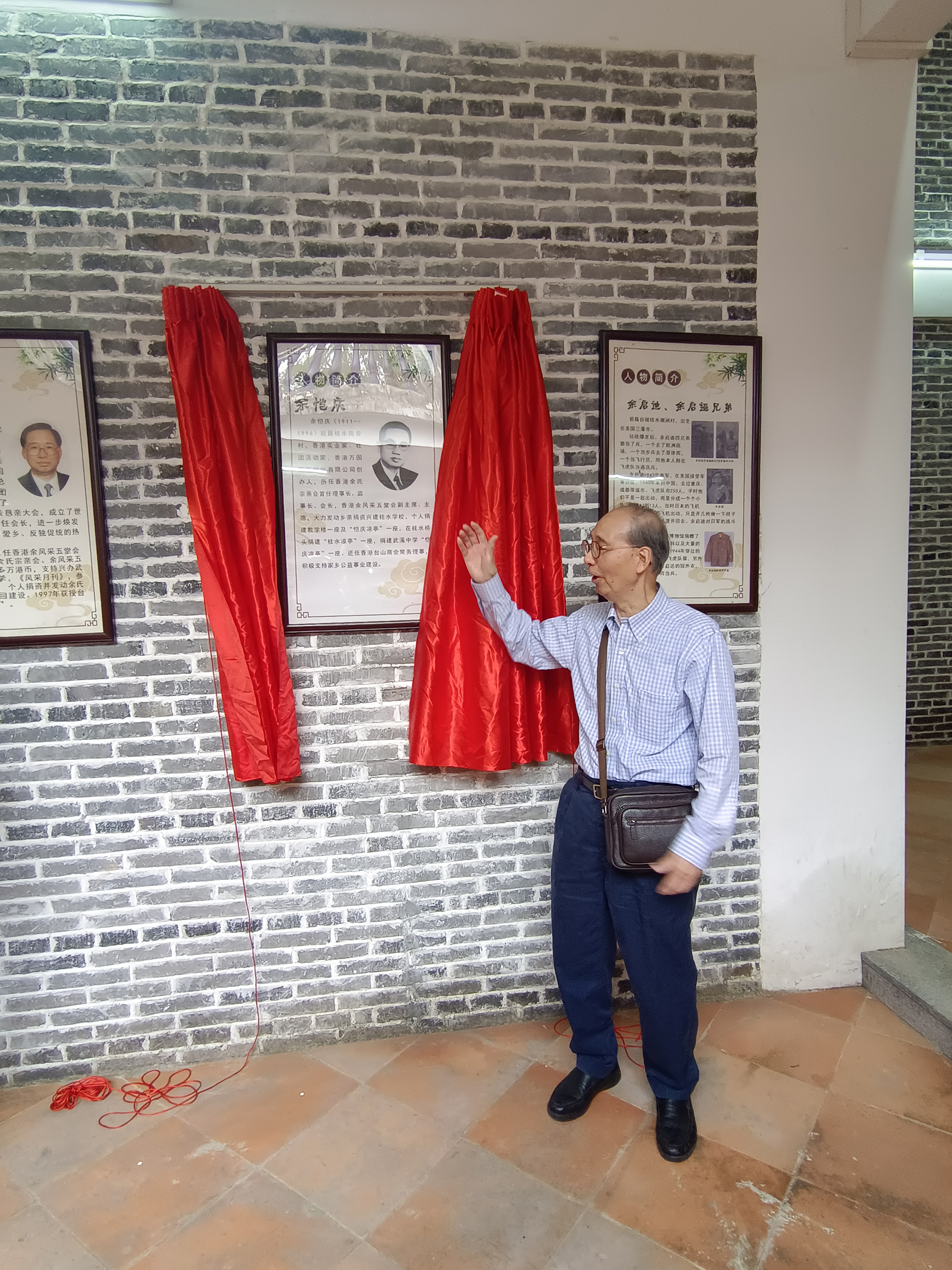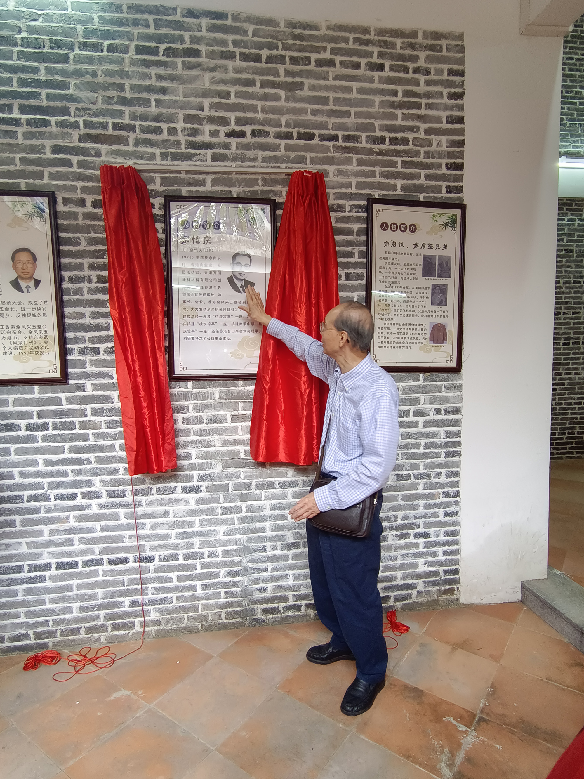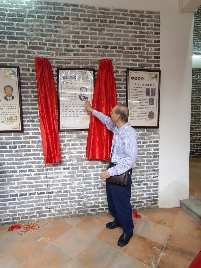 抵达当天,桂水村委会书记兼主任余伟强、风采月刊社社长余民发热情接待,并全程陪同。一行人先乘坐观光车,参观了桂水村村场及主要文明村示范点,随后前往新落成的“良甫余公祠”。在祠堂内,余伟强书记特意准备了一份惊喜——为余健伦会长的先父举行桂水历史人物“余恺庆简介”揭牌仪式。红绸缓缓揭下,现场庄重而喜悦。