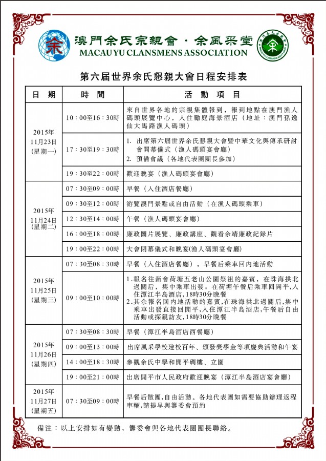 附录(一)第六届世界余氏恳亲大会日程安排表